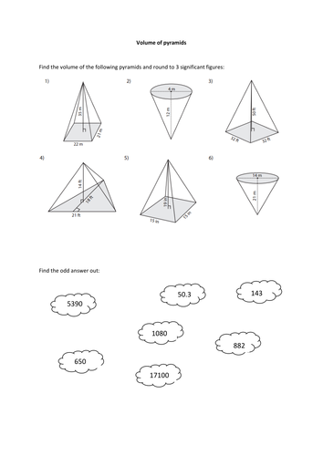 Volume Of Prisms And Pyramids Worksheet Teaching Resources ... Volume of Solids Worksheet Pages 1-2: Solids include: Prisms, Cylinders, Cones, Pyramids and Spheres; 12 Problems total Pages 3-4: Answer KeyA nice worksheet that can be used for in class review, as homework, or an assessment.Surface Area and Volume Bundle NOTE: This resource has been opted-in for the TPT Digital Easel tool for teachers to create their own personalized overlay for their ... Volume Of A Pyramid Worksheets & Teaching Resources | TpT This product is aligned with ccss.7.G.A.3 and B.6 material, focusing on finding the volume of a rectangular pyramid when given the length, width and height. Students will get practice using whole numbers, decimals AND fractions when finding the volume. When all the measurements are computed students Subjects: Math, Basic Operations, Geometry