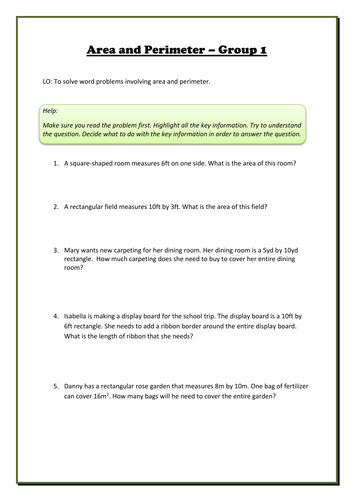 Area And Perimeter Word Problems Worksheet Teaching ... We offer you a free set of worksheets covering area and perimeter. There is one 4-page worksheet for solving area problems and one 4-page worksheet for solving perimeter problems.These worksheets are perfect for homework, classroom activities, revision, and integrating test prep into everyday learning.NEW!